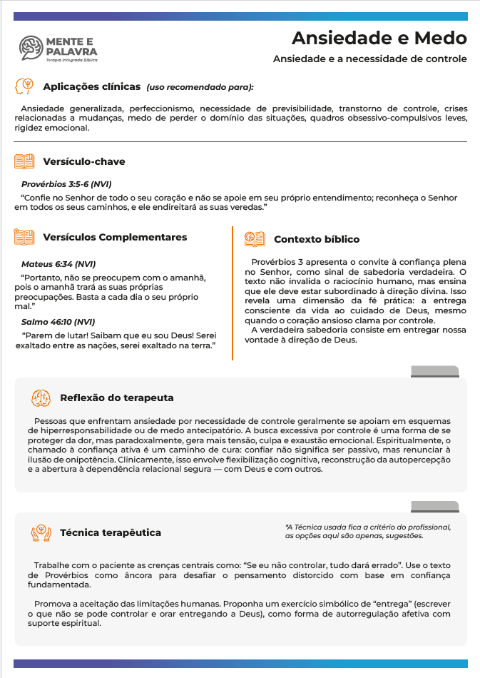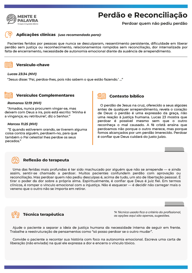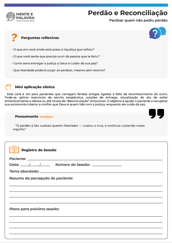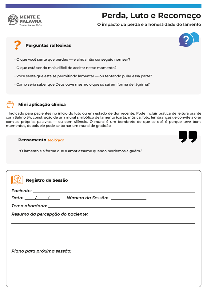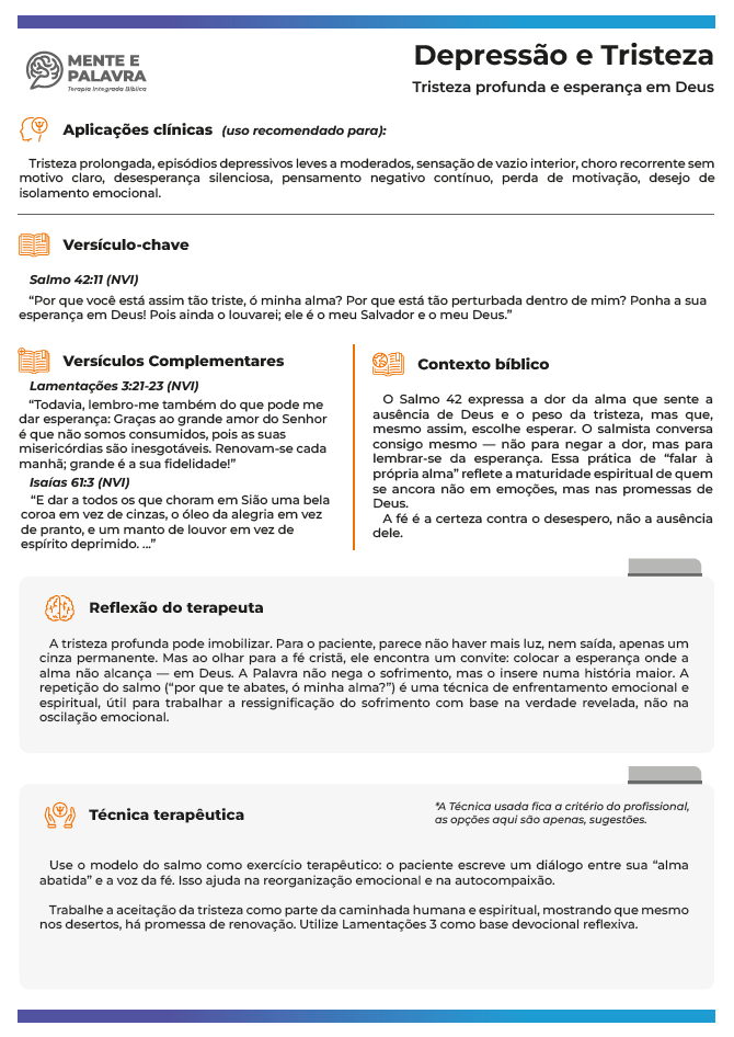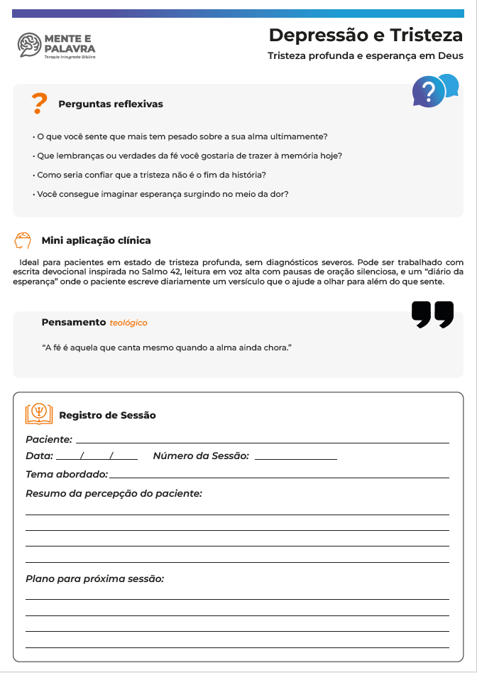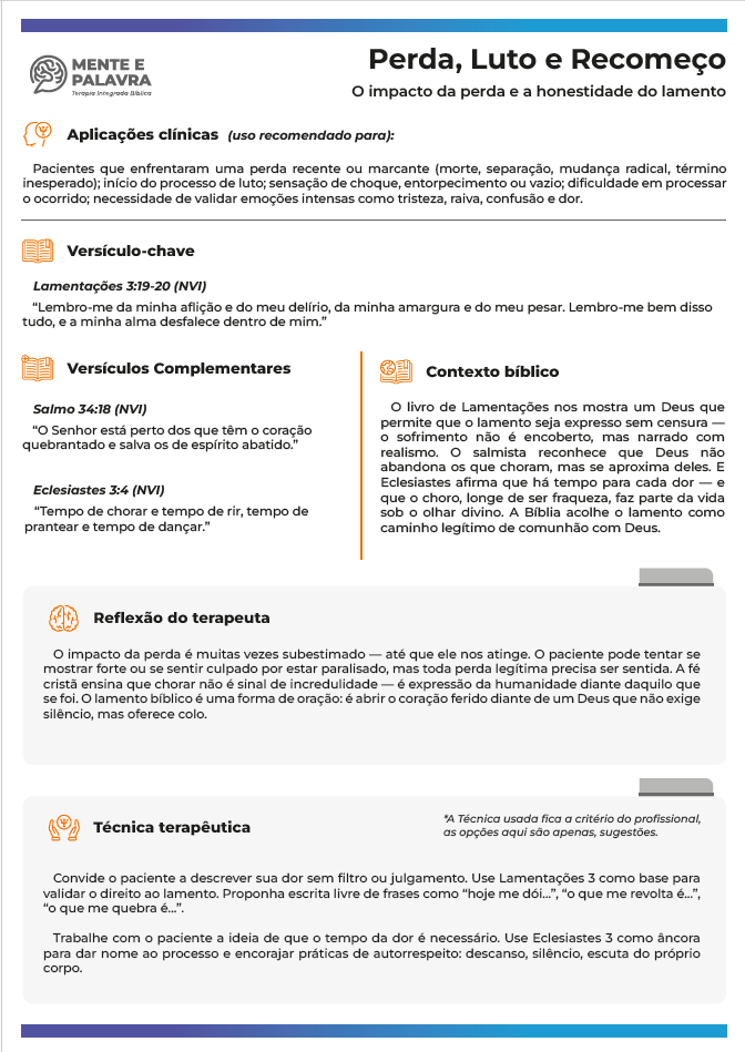 • É um instrumento complementar para sessões clínicas e espaços terapêuticos, que oferece reflexões bíblicas cuidadosamente contextualizadas, perguntas transformadoras e aplicações compatíveis com diversas abordagens (TCC, psicodinâmica, integrativa, etc.). Indicado para terapeutas, conselheiros, capelães e líderes que acolhem a dimensão da fé como parte legítima do sofrimento humano.