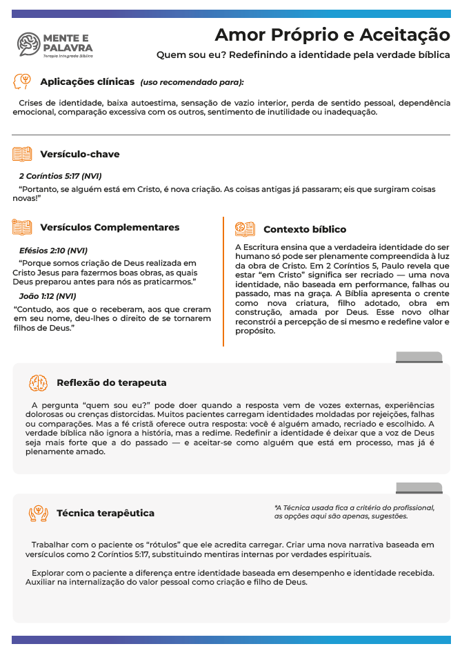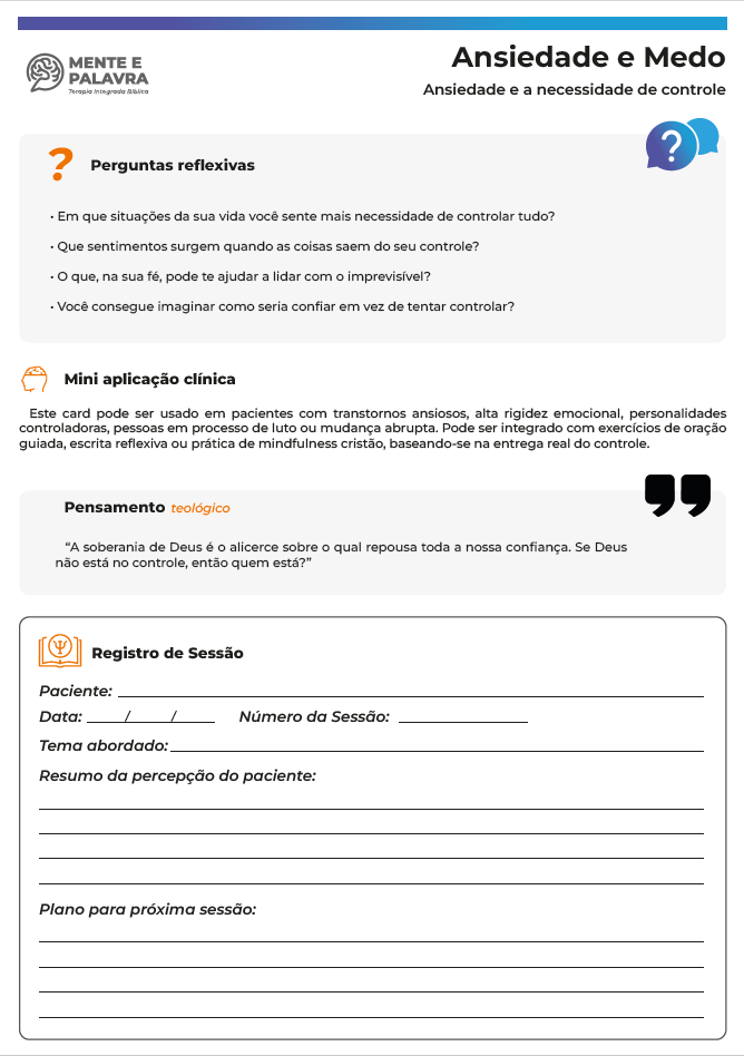 Cada card foi cuidadosamente elaborado para unir sensibilidade clínica, profundidade bíblica e aplicação prática. A estrutura é simples, clara e funcional, pensada para facilitar o uso em atendimentos, grupos terapêuticos ou estudos individuais.